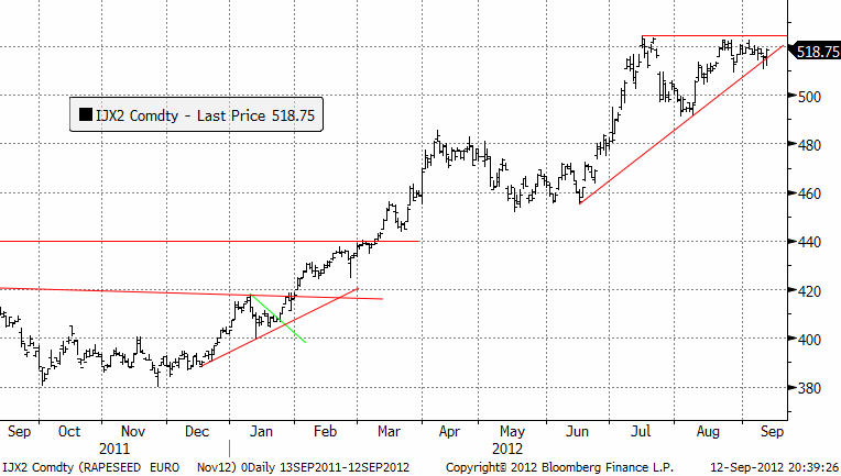 ”Tryckkokaren” har fortsatt och ett utbrott uppåt rycker allt närmare. Vi rekommenderar att man behåller sin långa (köpta) position i rapsfrö. Om priset skulle gå under 497 bör man börja lätta på positionen, men priset kan faktiskt gå ända ner till bottennoteringen i augusti utan att den uppåtriktade trenden är bruten.