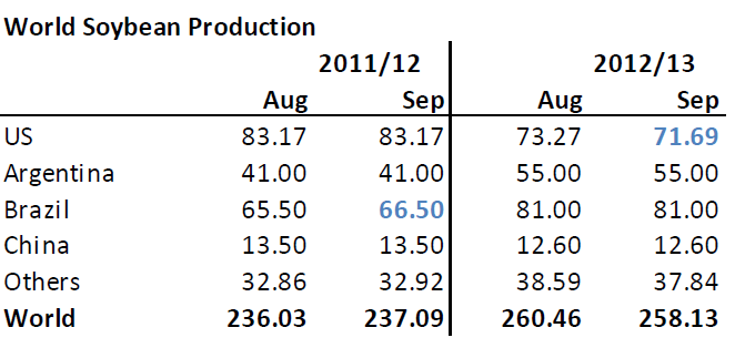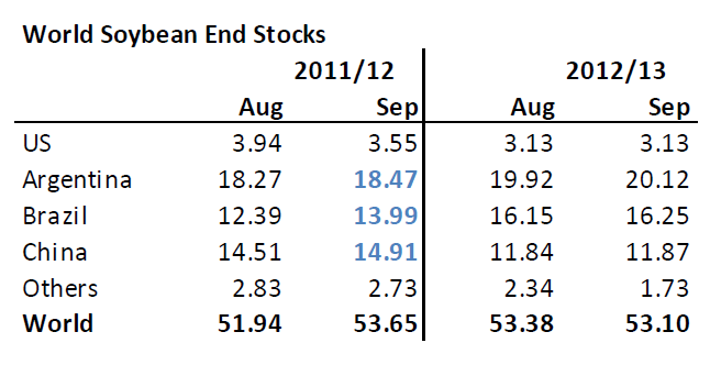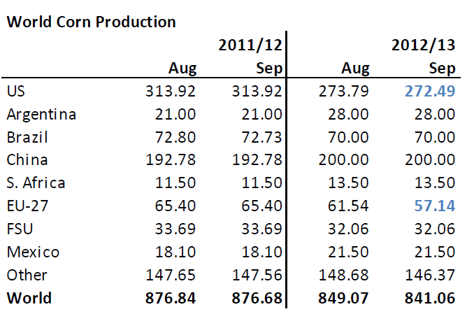 Notera den märkliga höjningen av utgående lager för 2011/12 i USA. Det här kommer från den tidiga skörden, där 11% av amerikansk majs är skördat före den 1 september. De skriver så här: “150 Mbu old crop corn displaced from feed due to early new crop, which will also boost old crop stocks”. Men vänta lite… borde inte detta på något sätt ha påverkat 2012/13? 11% mindre hamnar trots allt på 2012/13.