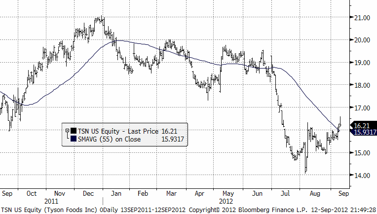 Det finns börsnoterade företag i USA som köper sojamjöl och producerar kött. Ett sådant bolag är Smithfield Foods. Ett annat är Tyson Foods. Nedan kan du se kursutvecklingen för den aktien. Notera hur tvärt kursuppgången, baserad på förhoppningar om mer helikopterpengar från Benny Bernanke, vände ner idag när WASDE-rapporten kom.