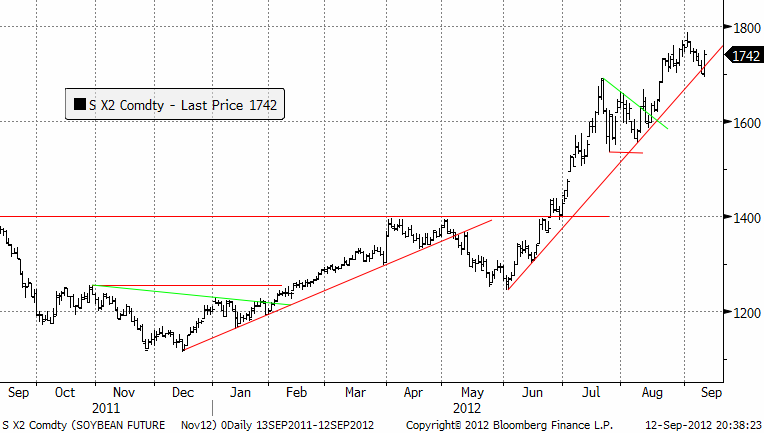 Sojabönsrapporten från USDA var tycks till skillnad från vete och majs, vara ganska genomtänkt. Den var ”bullish” för sojabönor och priset, som handlades ner innan, fick ny skjuts uppåt på rapporten.