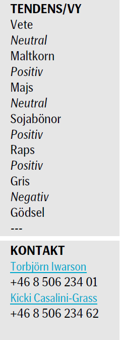 Vi väljer dock på tekniska grunder att rekommendera neutral position i vete och majs, men risken är på uppsidan om det skulle (be)visa sig att USDA varit allt för optimistiska. Sojabönor är vi positiva till, liksom raps. Socker kan ha funnit en botten.
