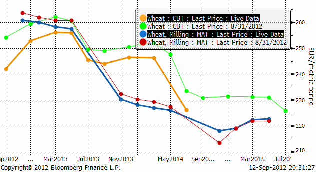 I diagrammet nedan ser vi terminspriserna framåt i tiden för Chicago och Matif och förändringen från 7 dagar sedan.