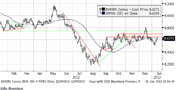 EURSEK stärktes successivt under veckan som gick och nådde upp till de gamla motståndsnivåerna. Det finns inte mycket ny information som ger anledning till att anta annat än att den ”sidledes” rörelse vi sett de senaste månaderna ska fortsätta.