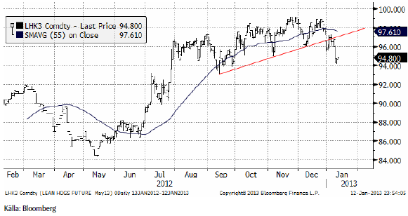 Grispriset (Maj 13), amerikansk Lean Hogs, har brutit en teknisk stödnivå (röd linje i diagrammet nedan). 94 cent per pund var första stödnivån, men antagligen fortsätter priset ner mot 92 cent i första hand.