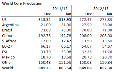 USDA justerade upp sojabönsproduktionen 2012/13 i fredagens WASDE-rapport. Brasilien höjdes, vilket är i linje med lokala prognoser. USA höjdes också, men Argentina sänktes. USDA sänkte även Argentinas uppskattade skörd förra året, vilket då slår på utgående lager för 12/13.