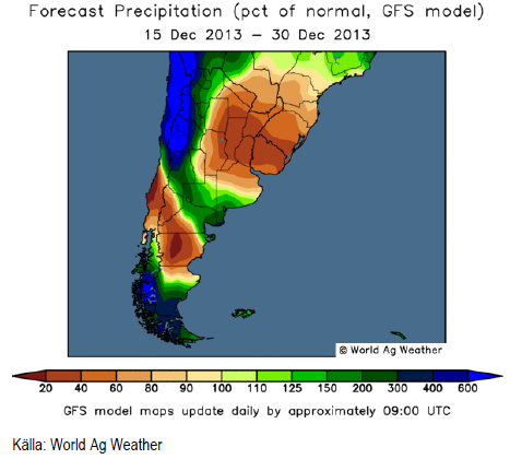I Sydamerika, kan vi notera att det är onormalt varmt och lite nederbörd i norra Argentina, landets kornbod. Vi ser detta i kartbilden nedan.