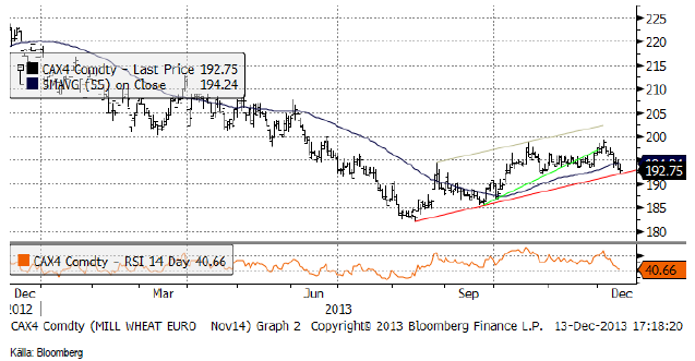 Tekniskt stängde Matif precis på stödet för uppgången från början av augusti. Eftersom Chicagovetet i fredags gick under stödet på 664 cent (basis Dec 2014-kontraktet), skulle det inte förvåna om Matif bröt stödet och inledde en rekyl nedåt. November 2014-kontraktet låg i fredags på 192.75 och om stödet bryts finns nästa stöd på 185 euro. Vi skulle tro att priset går dit. Eventuellt finns stöd på 190, där priset kan studsa som hastigast.