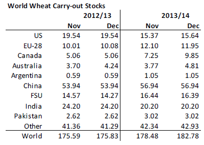 I tisdags kom så årets sista WASDE-rapport från USDA. USDA fick med och tog till sig de nya högre produktionsestimaten från veckan innan från Kanada (37.5 mt) och Australien (26.5), men gjorde inte det för Argentina, där USDA fortfarande har 11 mt. Det står ju helt klart att Argentinas produktionsestimat är lågt därför att det då begränsar exporten till 1.5 mt och inte 4 mt som det hade varit om de hade sagt 11 mt. Sammantaget justeras alltså global produktion 2013/14 upp med 5 mt till 711.42 mt.