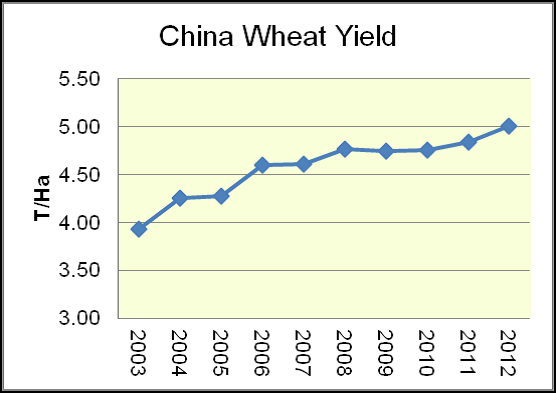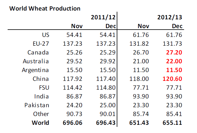 Vi ser att USDA höjde skördeprognosen för 2012/13 med 4 mt. Uppjusteringarna gjordes för Kanada, Australien och Kina. Däremot gjorde man inte någon förändring för Argentina. USDA uppskattar Kinas vete produktion 2012/13 till 120.6 mt, vilket är en ökning med 2.6 mt från förra månaden. Den estimerade arealen på 24.14 miljoner hektar har justerats ned något medan estimerad avkastning justeras upp till rekordhöga 5.0 ton per hektar. Revideringarna bygger på de senaste officiella uppgifterna från Kinas National Bureau of Statistics. Enligt rapporter så visar de 11 största vete producerande provinserna högre avkastning 2012, vilket är det nionde året i rad med stabila eller stigande avkastningar. Gynnsamt väder under hela perioden, från sådd till skörd, har varit faktorn som bidragit till en rekordskörd av höstvete 2012.