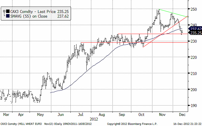 Nedan ser vi kursdiagrammet för kommande skörd, november 2013. Priset bröt den uppåtgående stödlinjen vid strax över 240 euro per ton som en respons på WASDE-rapporten. Därefter har priset fallit ner till stödlinjen vid 235 euro. Där fanns köpare. Det är möjligt att det kommer en rekyl uppåt i veckan. Vi anser att den rekylen uppåt i så fall är ett säljtillfälle, och rekylen bör maximalt, enligt den tekniska analysen, gå upp mot 240 euro, men troligtvis inte över.