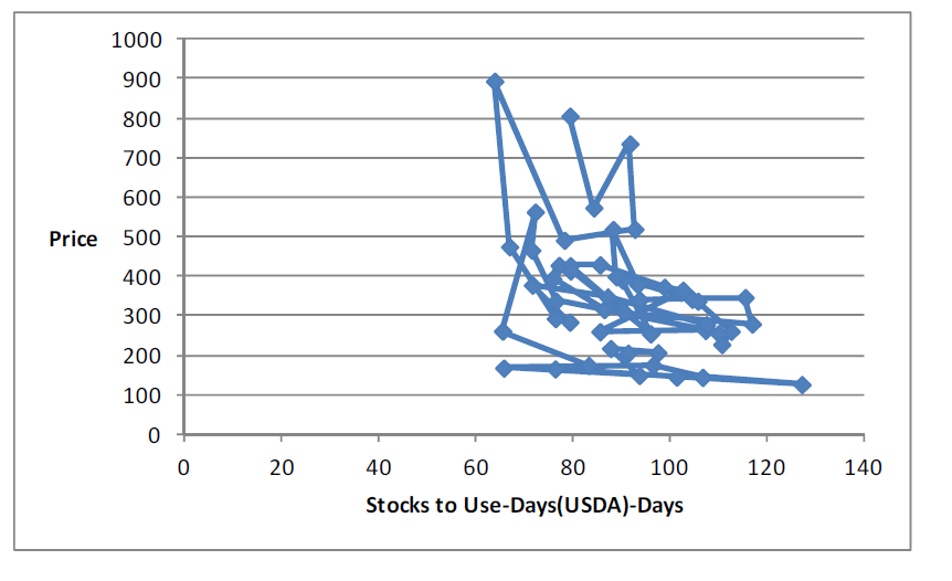 Nedan ser vi utgående lager (prognosen) i förhållande till pris. Vi ser att majs aldrig varit så dyrt. Eftersom det inte finns några omkringliggande punkter (pris vs lager) att ta som referens, kan vi inte säga om priset är omotiverat högt eller inte. Bara att det högt.