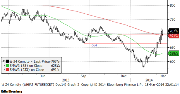 Chicagovetet steg kraftigt, men har nått upp till tekniska motståndsnivåer vid 700 -725 cent per bushel, där uppgången borde stöta på patrull.