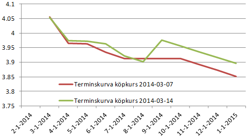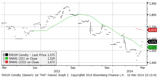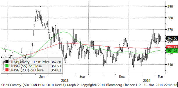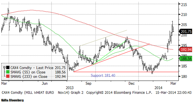 Förra veckan var händelserik. Dels kom USDA-rapporten, som i sig var rätt tråkig, men den sänkte oron och fick priserna att falla initialt. Faktorer utanför marknaden påverkade mycket, med oron för utvecklingen i Ukraina i centrum. Väderleksprognoserna har slagit om till blötare, vilket fått en del marknader på fall. Sojabönor föll med 6%, rapsfröet med lite mindre. Chicagovetet steg med 6%, vilket möjligen är en överreaktion, medan kvarnveteterminerna i Paris faktiskt föll med 2%. Grispriset i Chicago steg med 6% och började dra med sig priserna på Eurex. Mjölkpriset steg i USA, på basis av stark export, framförallt till Kina. Socker började visa svaghetstecken pga att torkan förbytts i onormalt mycket regn, särskilt i prognosen. Kinas industriproduktionsstatistik för februari som publicerades i torsdags var oväntat svag och bekräftar den tidigare trenden mot svagare tillväxt i Kina. Under helgen meddelade Kina att man vidgar bandet som valutan tillåts fluktuera inom. Jag tolkar det som att Kina vill devalvera sin valuta.