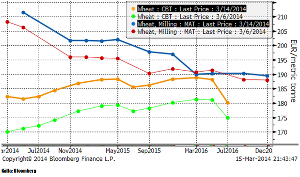 Nedan ser vi terminskurvorna för Chicagovete och Matif i fredags och veckan innan. Terminskurvan för Chicago fortsätter att bli allt flackare.