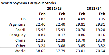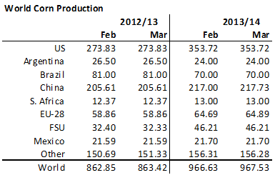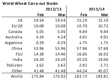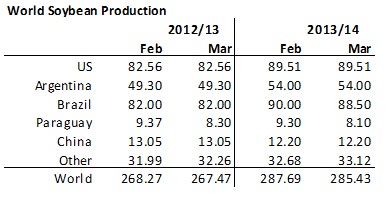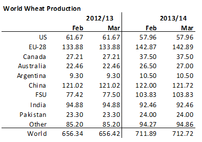 I måndags publicerade USDA som bekant sin WASDE-rapport för 2013/2014. Det mesta är redan skördat sedan länge, men USDA gjorde mindre justeringar, där de gick över till att använda respektive lands officiella produktionsuppgifter. De justerade dock upp skörden i Australien och därför blev det en höjning på global basis från 711.89 mt till 712.72 mt.