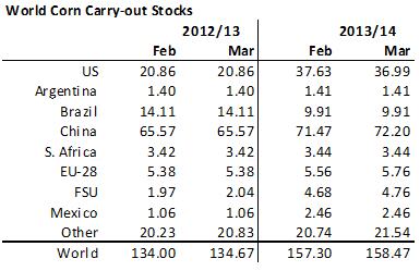 USDA höjde utgående lager för 2012/13 med 0.67 mt och detta tillsammans med högre produktion i Kina leder till drygt 1 mt högre utgående lager.