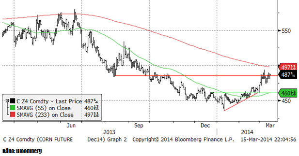 Decemberkontraktet på majs stängde i fredags på oförändrat pris jämfört med fredagen innan. Det finns ett tekniskt motstånd på den här nivån. Marknaden står just nu och väger mellan en fortsatt rekyl nedåt eller ett nytt test av motståndet.