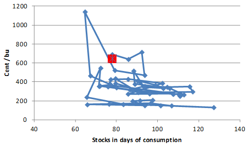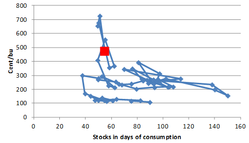 Nedan ser vi pris i förhållande till lager. Varje punkt är ett års relation mellan pris och lager sedan början av 60-talet. Priset ser inte ut att avvika från vad man kunnat vänta sig vid den här lagernivån. Om lagernivån höjs i och med årets skörd, kan man vänta sig ett pris ner mot 400 cent.