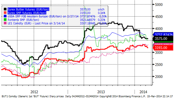 I diagrammet nedan ser vi att såväl frontmånadskontraktet på SMP på Eurex (röd) som smör (svart) sjunkit. Fonterra (grön) är ungefär på samma nivå som förr veckan och terminer på SMP i USA är något högre – för ovanlighetsskull något högre än på EUREX, omräknat till Euro per ton.