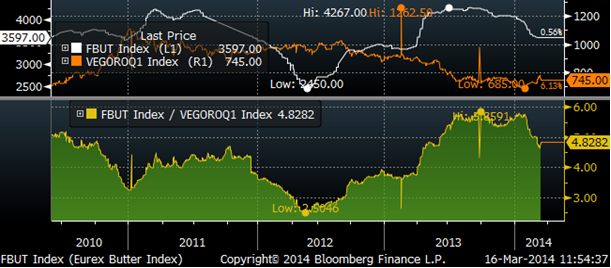 Priset på smör har den senaste tiden fallit något snabbare än prisfallet på vegetabiliskt fett. Den senaste tiden har priset gått upp på vegetabiliskt fett – orsakat bland annat av prisuppgången på palmolja. Nedanför ser vi relationen mellan Eurex smör-index i Euro per ton och UkrAgroConsults nontering på rapsolja FOB Rotterdam, också i Euro per ton. Vi ser att priset på smör nådde en rekordhög premie över rapsolja strax efter sommaren förra året. Smör var då nästan 6 gånger dyrare än rapsolja. Sedan dess har priset på både smör och rapsolja fallit, men smöret har fallit mer och är nu ”bara” 4.8 gånger dyrare än rapsolja. Även det är en historiskt mycket hög premie för smör. Smöret var som billigast i relation till rapsoljan i april 2012 när den bara var 2.5 gånger dyrare.