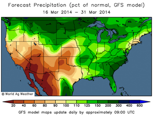 Väderleksprognosen för de kommande två veckorna för alla de viktiga jordbruksområdena i världen har slagit om till betydligt blötare väder och sätter punkt för den torka som har drivit upp priser på jordbruksprodukter. I USA förutspår GFS-modellen t ex ovanligt mycket nederbörd de kommande två veckorna. Norra Texas och en bit in i Kansas väntas det däremot vara lite torrare än normalt. Det är vete-områden.
