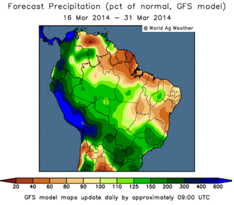 Sydamerika, som drabbats av torka i januari och februari med prisuppgångar på sojabönor, socker och inte minst på kaffe, har fått en del regn i veckan som gick och väntas få onormalt mycket regn de kommande två veckorna enligt GFS-modellen. Det allra mest torkdrabbade området i södra Minas Gerais, som också är centrum för landets kaffeproduktion, väntas få mest nederbörd.