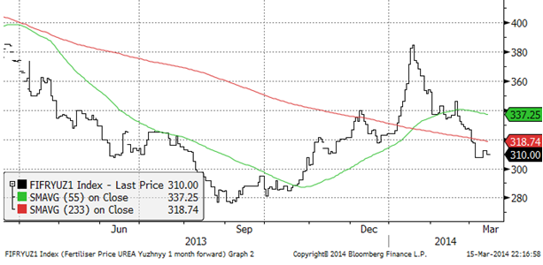 Urea-priset, FOB Yuzny, ligger kvar på låg nivå vid 310 dollar per ton.
