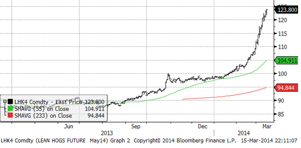 Lean hogs fortsatte sitt ”bull run” och steg från 117.75 förra veckan till 123.8 cent i fredags.