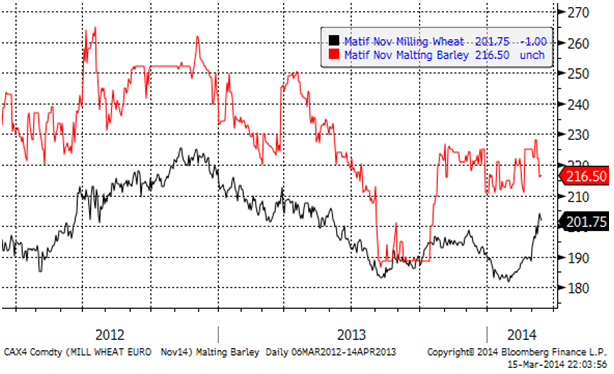 Maltkornsterminerna har blivit allt mindre handlade. För några år sedan gick det att handla 1000 tons ordrar utan större problem. Det skulle det nog inte göra idag. Marknaden är illikvid och det är nog huvudförklaringen till att maltkornsterminen för novemberleverans föll med 10 euro till 216.50 Euro per ton samma vecka som vetepriset rusade till 216.50 Euro per ton.