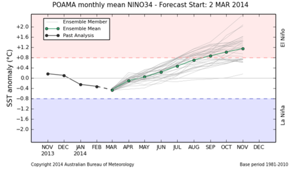 Från att ha varit mindre än 50% sannolikhet för ett El Niño i höst, rapporterar nu Australiens meteorologiska institut att deras ensembleprognos pekar på högre än 50% sannolikhet.