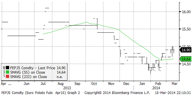 Potatis för leverans i april nästa år steg 20 eurocent till 14.90. Det låga priset i januari – februari kan ha avskräckt från odling, med högre pris som konsekvens.