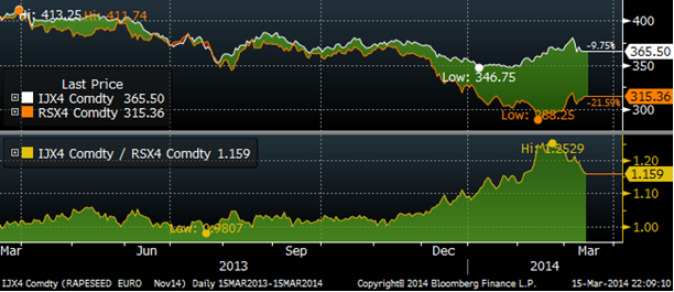 Kanada har nu ”tinat” och det har fått priset på canola att stiga från 388.25 till 315.36 euro per ton (omräknat från CAD). Vi tror att den här ”spreaden” kommer att fortsätta att gå ihop med en ytterligare potential på minst 10% från 15.9% till 5.9% skillnad. Det har den senaste månaden mestadels skett genom att canola-kontraktet för november stigit i pris, men nu senast även genom att rapsfröterminen fallit i pris.