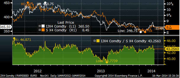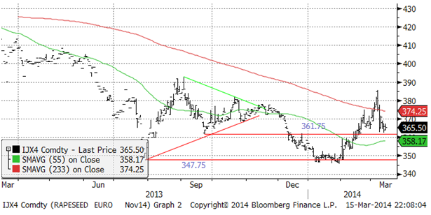 Rapspriset föll kraftigt efter att marknaden noterade en ”key reversal day” den 7 mars. Prisnedgången fick stöd vid den gamla tekniska nivån 361.75. Det återstår att se om den bryts och priset fortsätter att falla, men det skulle inte förvåna om detta händer. Två faktorer talar för detta: För det första ett närmande mellan priset för kandensisk canola och för det andra en väntad svag marknad för sojabönor (se ovan).