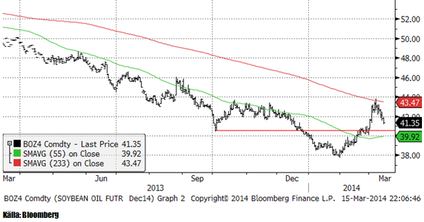 Sojaoljan sjönk med 7% i pris för ny skörd (december) och föll därmed i pris för andra veckan i rad, efter att ha stigit i hela februari. Tekniskt stöd finns först på 40 cent per pund.