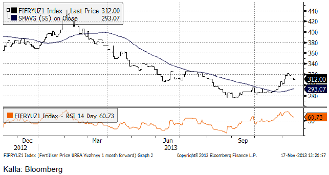 Priset på kväve / urea som förra veckan stängde på 303 dollar per ton, inledde veckan med att stiga till över 320 dollar, innan priset rekylerade ner och stängde veckan på 312, en uppgång med 9 dollar per ton.