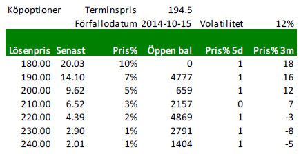 Nedan ser vi priserna på köpoptioner på Matif på November-2014 (Matif vete). Notera att volatiliteten har sjunkit ytterligare från 13 till 12% på årsbasis. Det är innebär att optioner på vete är billigare än på länge.