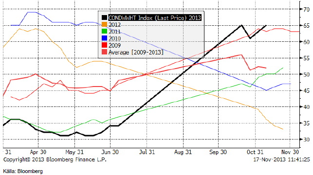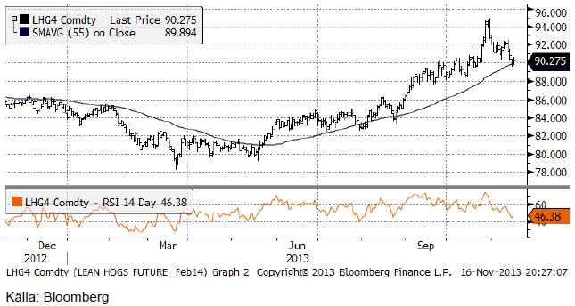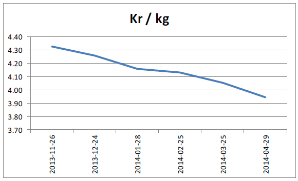 Hela kurvan ligger ca 12 -20 öre / Kg högre än förra veckan. Höjningen är störst för februari 2014 (+20 öre) och lägst för november och december 2013 (+12 öre). För de lite längre kontrakten, från juli och framåt, där det inte finns någon handel och priserna är något mer osäkra stannade veckans prisuppgång på +8 öre, men dessa är som sagt inte handlade priser.