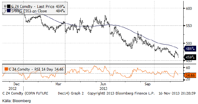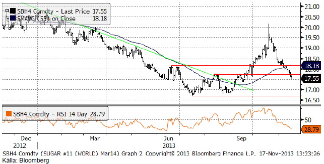 Marskontraktet på råsocker föll ner till 17.55 cent i fredags. Det är den lägsta prisnivån sedan i september. RSI-index på 28.79 (<30) indikerar en översåld marknad och man kan vänta sig ett slut på prisfallet, följt av en rekyl uppåt. Priset är vid nivåer där det funnits tekniskt stöd / motstånd tidigare, under augusti och september. Dessa två tekniska faktorer: RSI och gamla stödnivåer, talar för en vändning uppåt i veckan som kommer.