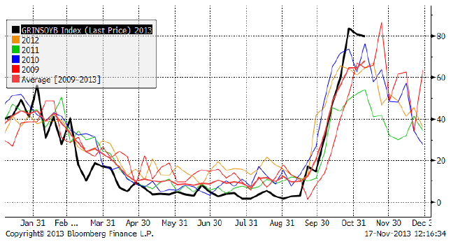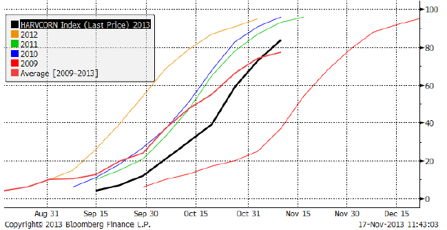 Crop Progress rapporten från USDA fortsätter att visa på en snabb framfart för skörden av majs i USA, med en ökning från 73% per den 3 november till 84% en vecka senare, vilket gör att skördetakten ligger strax över det femåriga genomsnittet på 79%. Tar man en närmare titt på ”I-staterna” så är skörden avklarad till 93% respektive 85% i Illinois och Indiana. Ytterligare en aktiv vecka för lantbrukare i Iowa som nu har skördat 88%, en siffra som nu ligger över genomsnittet på 80%.