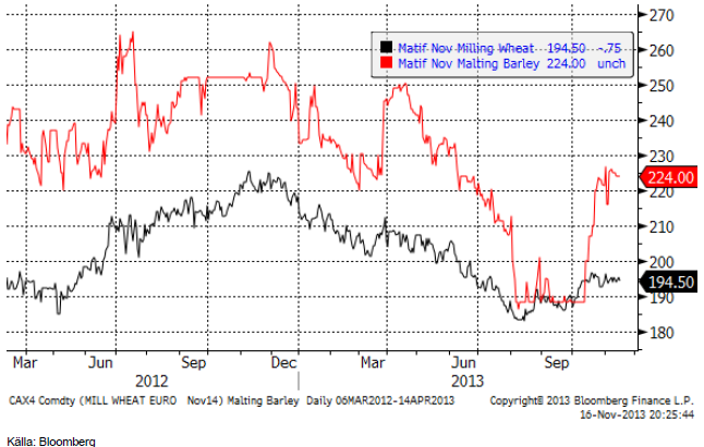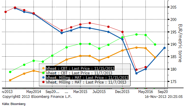 Nedan ser vi terminskurvorna för Chicagovete och Matif. Förändringarna i terminskurvan för Matifvete utgörs av oförändrat pris för de kortare kontrakten, men ett par euro lägre pris för skörd 2014. Terminskurvan i Chicago flyttades i veckan ner med motsvarande 5 euro per ton oavsett löptid; lika mycket för december 2013 som för Juli 2016. Till viss del beror detta på att euron steg med 1% mot dollarn.