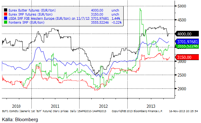Terminerna på smör och skummjölkspulver vid Eurex-börsen steg båda i veckan. Det gjorde även USDA:s notering på SMB FOB NWE och Fonterras SMP-pris. Eftersom även euron steg med 2% mot den svenska kronan, innebar detta en betydande prisuppgång i kronor per kilo.