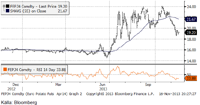 Potatispriset av årets skörd, fortsatte den senaste tidens prisfall, men fanns stöd vid 19 euro per deciton. Marknaden är kraftigt översåld och det bör kunna finna stöd vi de här nivåerna.