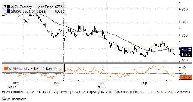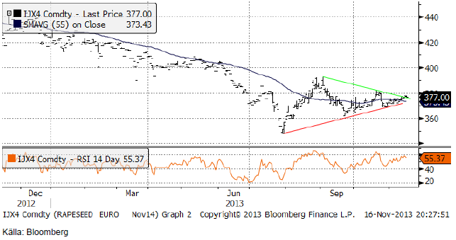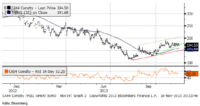 November 2014 – kontraktet på Matif har inte lyckats ta sig över 195 euro. Det ser ut som om det finns en ansamling av säljordrar på den nivån. Marknaden stängde på 194.50 euro per ton i fredags, vilket nu är precis på ett tekniskt stöd. Skulle nivån brytas, vilket sker på måndag om marknaden inte stiger, blir det ”fritt” ner till 190 euro per ton. Vi tror att det fallet kommer.