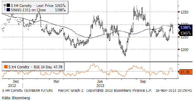 Terminskontrakten på sojabönor föll med ett par procent i veckan. Det var framförallt årets vinnare i sojasegmentet, sojamjölet, som föll i pris. Sojaoljan, som pressats hårt (ursäkta ordvitsen) lyckades hålla sig på oförändrad nivå genom veckan. Nedan ser vi mars-kontraktet, som föll kraftigt i fredags, efter att inte ha orkat igenom motståndsnivån 1300 cent, där det antagligen ansamlats mycket säljordrar från lantbrukare.