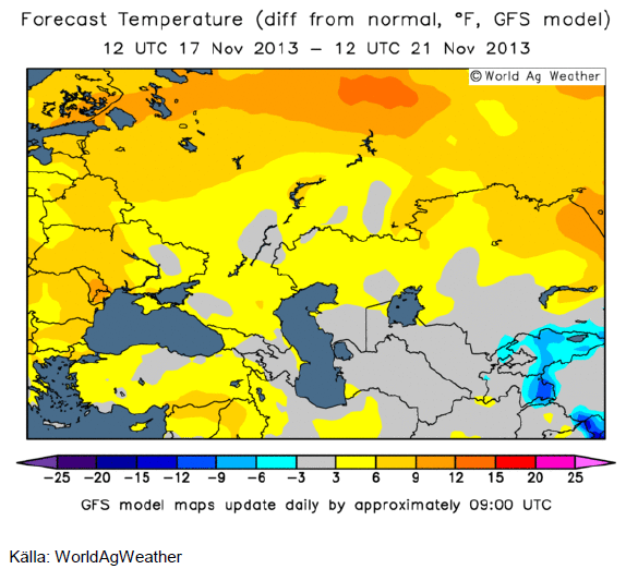 Ryssland håller fast vid sin prognos med en veteproduktion på 50 mt 2014/15, trots lägre sådd areal, då lantbrukare i landet förväntas fortsätta sådden av höstgrödor under november månad till följd av högre temperaturer än normalt. Så här långt uppgår sådd areal till ca 14.4 miljoner hektar (ungefär 88% av den förväntade arealen men fortfarande 8% lägre än förra året). Det varma vädret förväntas fortsätta framöver och i bl.a Moskva uppmättes den varmaste november-temperaturen på 130 år.