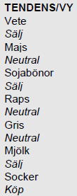 Sådden i Argentina var till 42% klar och ligger därmed efter den normala takten. Vi har tidigare haft köprekommendation och går över till neutral.