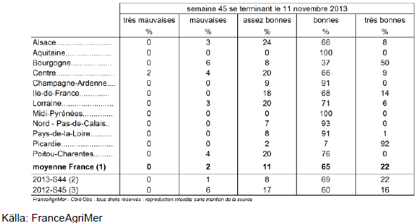 Sådden av höstvete i Frankrike är nu avklarad till 85& (per den 11 november), upp från 81% veckan innan. Andelen grödor klassade som ”good/excellent” uppgår till 87%, en nedjustering med 2%.