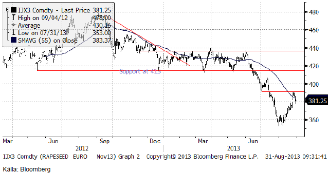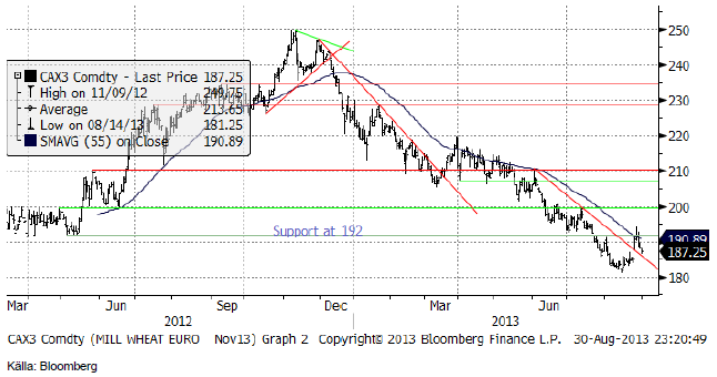 November vetet på Matif bröt det tekniska motståndet i början på veckan, men föll sedan tillbaka. Uppgången började redan när Chicagomarknaden öppnade för veckan klockan 2 på morgonen svensk tid. Det är asiatisk handelstid. Sojabönorna handlades limit up på vad som såg att vara panikstängning av korta positioner. Asien är den största importregionen. Efter en sådan ”blow-out” är det vanligt att prisrörelsen stannar upp och det gjorde den också. När köpbehovet borta, för stunden i alla fall, kunde så priserna falla tillbaka. Tekniskt måste vi inse att vi trots allt har fått ett brott av trenden nedåt. Om det blir bestående återstår att se. Vi gick över till neutral rekommendation i förra veckans brev och vi behåller den.