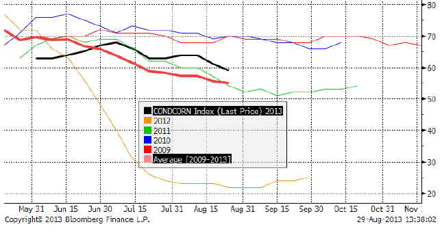 Måndagens Crop Progress från USDA visade ett något försämrat tillstånd för den amerikanska majsen. För de 18 stater som rapporterar så klassas 59% som ”good/excellent”, ner 2% från veckan innan men väl över förra årets 22% (då torkan tog död på stor del av all majs) samt över det 5-åriga genomsnittet på 56%. Tittar vi tillbaka så kan vi se att tillståndet långsamt har försämrats sedan början på juli då 68% var klassat som ”good/excellent”. För de tre stora producenterna Iowa, Illinois och Indiana har ”good/excellent” justerats ner med 14%, 9% resp. 9% sedan den 7 juli.