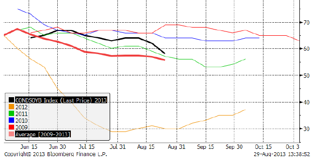 84% av grödorna har uppnått stadiet baljsättning, en ökning från förra veckans 72%. Förra året vid den här tiden låg siffran på 95% och det 5-åriga genomsnittet ligger på 90%. Den globala produktionen av sojabönor estimeras till 282.5 mt av Oil World, vilket är 1.7 mt lägre än tidigare estimat pga försämrade utsikter för grödorna i USA och Kanada.